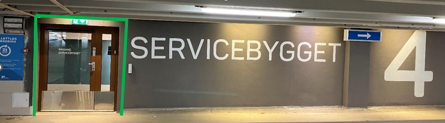 Kjør opp til plan 4 i P-huset (P4), ta til venstre når du kommer inn på P-planet, og parker i nærheten av veggen som er skiltet med «Servicebygget». Se bilder under: