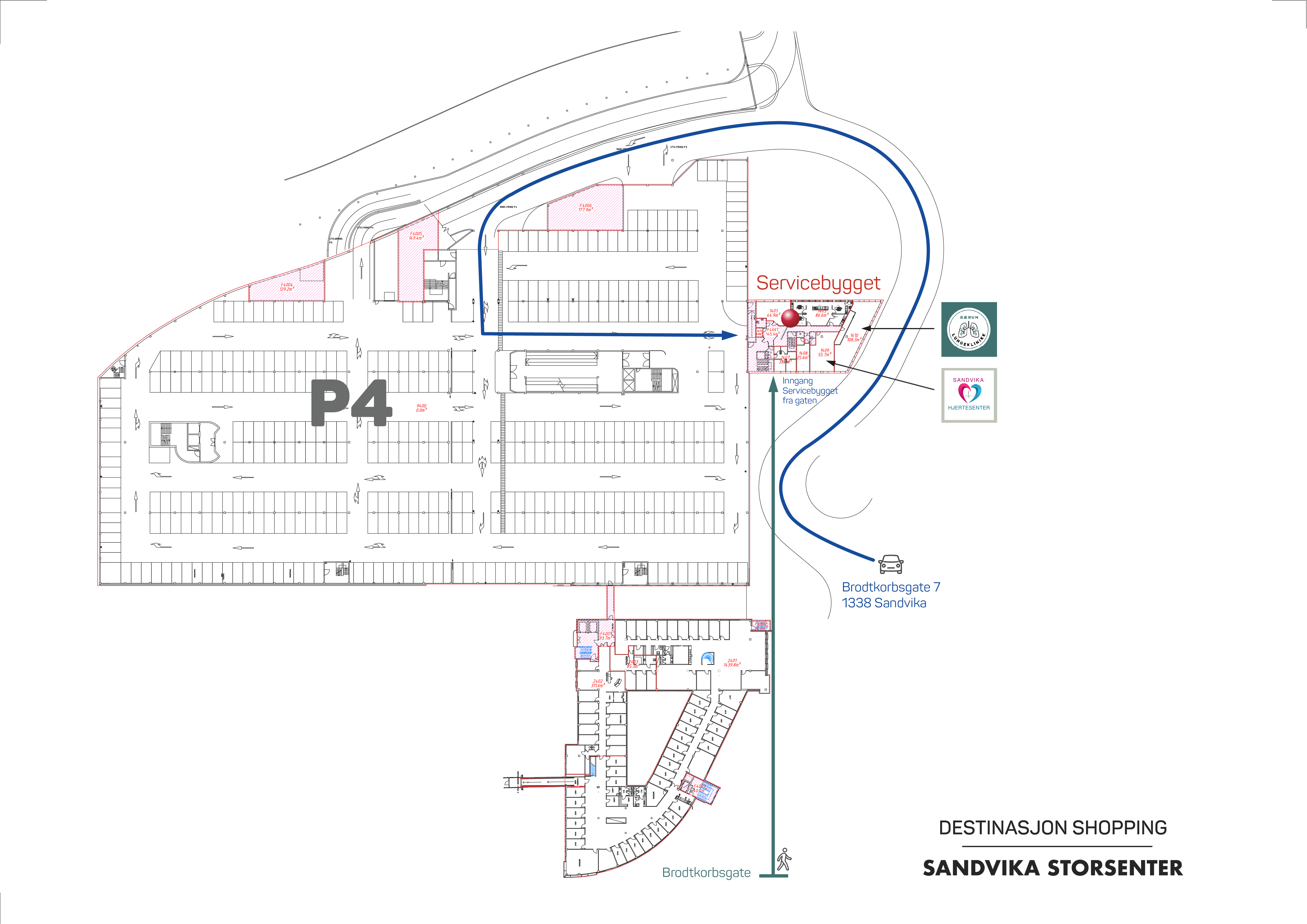 Kjør til Sandvika Storsenter sitt P-hus i den gamle delen av senteret (Brodtkorbsgate 7).