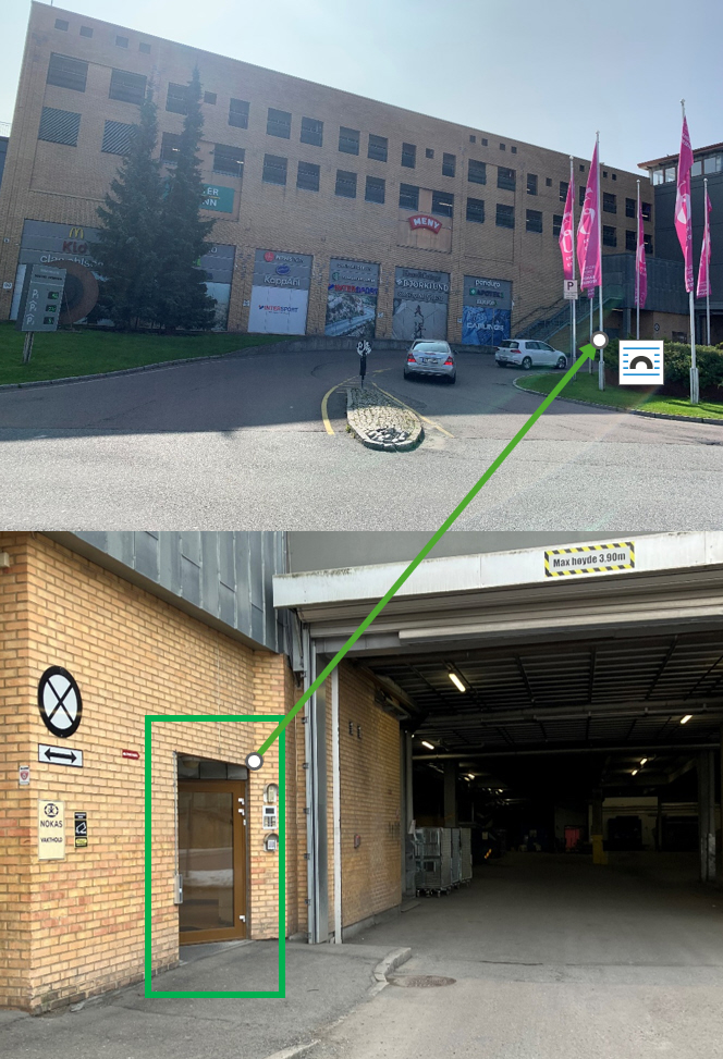 Gå inn glassdør på gateplan merket med «Servicebygget» til venstre for varemottaket ved innkjøring til den gamle delen av senteret vis a vis toglinjen i Brodtkorbsgate 7.